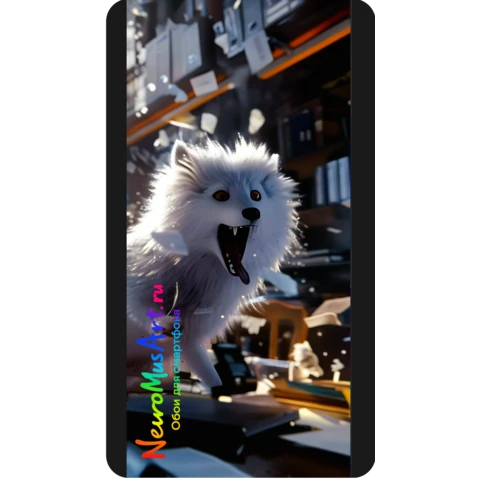 Оригинальные обои для смартфона в UHD 4K качестве с белым пушистым зверем в комичной и хаотичной сцене. Драйв, экспрессия и юмор в каждом пикселе. Original UHD 4K smartphone wallpaper featuring a fluffy white creature in a comical and chaotic scene. Drive, expression, and humor in every pixel.