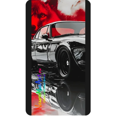 Энергичные UHD 4K обои: чёрный спорткар с отражениями и силуэт красного волка на фоне — символ дикости и силы. Energetic UHD 4K wallpaper: a black sports car with reflections and the silhouette of a red wolf in the background — a symbol of wildness and power. Автотема / Cars