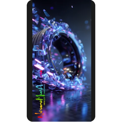 UHD 4K обои для флагманских смартфонов (Samsung S24 Ultra, iPhone 16 Pro и др.): крупный план автомобильного колеса, окружённого осколками стекла и неоновыми отблесками. Символ силы, прорыва и скорости. UHD 4K wallpapers for flagship smartphones (Samsung S24 Ultra, iPhone 16 Pro, etc.): a close-up of a car wheel surrounded by shards of glass and neon reflections. A symbol of power, breakthrough, and speed.