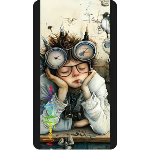 UHD 4K обои для флагманских смартфонов (Samsung S24 Ultra, iPhone 16 Pro и др.): забавный портрет мальчишки-изобретателя в защитных очках, который уснул прямо за своим столом. Тёплая, ироничная сцена с элементами фантазии и лёгкого юмора. UHD 4K wallpapers for flagship smartphones (Samsung S24 Ultra, iPhone 16 Pro, etc.): a funny portrait of a young inventor in protective goggles who fell asleep at his desk. A warm, whimsical scene filled with imagination and gentle humor.