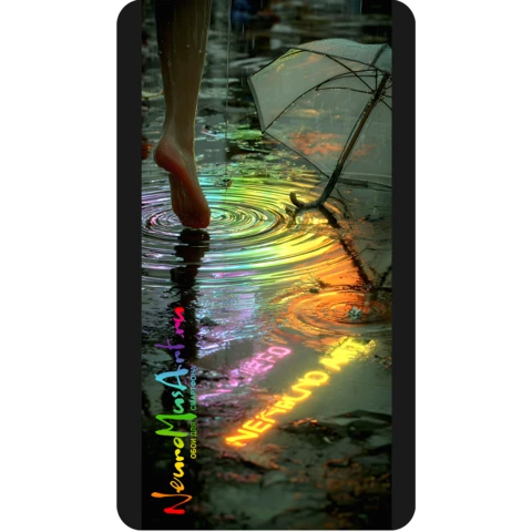 UHD 4K обои с неоновыми отражениями в луже, прозрачным зонтом и лёгкой женской ногой, касающейся воды. Атмосфера дождливого вечера, городского уюта и магии огней создаёт настроение романтики и лёгкой меланхолии. UHD 4K wallpaper featuring neon reflections in a puddle, a transparent umbrella, and a delicate female foot touching the water. A rainy evening filled with cozy city vibes, magic lights, romance, and subtle melancholy.