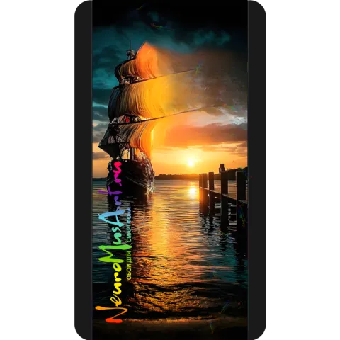 Парусник с золотыми парусами уходит в закат, отражаясь в спокойной воде. Атмосфера свободы и приключений.EN: A majestic ship with golden sails sails into the sunset, reflected in calm waters. A sense of freedom and adventure.