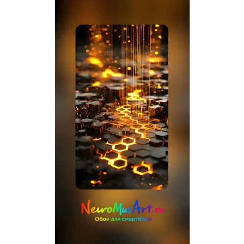 Обои для смартфона в UHD 4K качестве с сияющими золотыми сотами и потоками света, создающими атмосферу цифровой роскоши и силы.