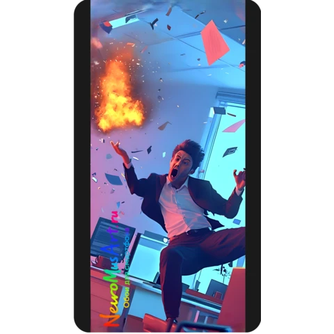 UHD 4K обои в стиле цифровой иллюстрации: офисный сотрудник посреди бумажного хаоса и пламени. Динамичная сцена с юмором и абсурдом, отражающая стресс и хаос на работе. Изображение относится к серии «День Сурка», где каждый день снова и снова превращается в повторяющийся хаос. Подходят для всех современных смартфонов в формате 9×20, включая версии со скруглёнными краями. UHD 4K wallpaper in digital illustration style: an office worker surrounded by paper chaos and flames. A dynamic scene filled with humor and absurdity, reflecting stress and chaos at work. Part of the “Groundhog Day” series, where each day turns into repeating chaos. Suitable for all modern smartphones in 9×20 format, including versions with rounded edges.