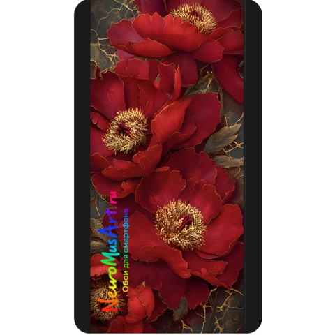 Роскошные UHD 4K обои с алыми пионами, подчеркнутыми золотыми прожилками. Атмосфера богатства, силы и изысканности делает этот дизайн идеальным акцентом для вашего смартфона. Формат 9×20 подходит для всех современных моделей, включая смартфоны со скруглёнными краями. Luxurious UHD 4K wallpaper featuring scarlet peonies highlighted with golden accents. The atmosphere of richness, strength, and sophistication makes this design a perfect statement piece for your smartphone. The 9×20 format fits all modern models, including phones with curved edges.